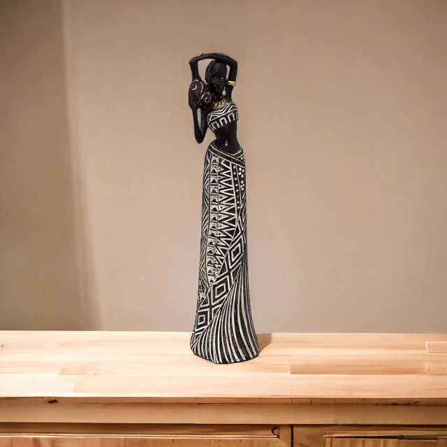 Seja como uma peça central em sua sala de entretenimento, um destaque em seu aparador ou uma adição refinada a sua estante de livros, esta escultura africana em resina carregando o vaso certamente conquistará corações e olhares. Não perca a oportunidade de enriquecer sua casa com essa peça única, levando consigo a tradição, a beleza e a emoção da arte africana.