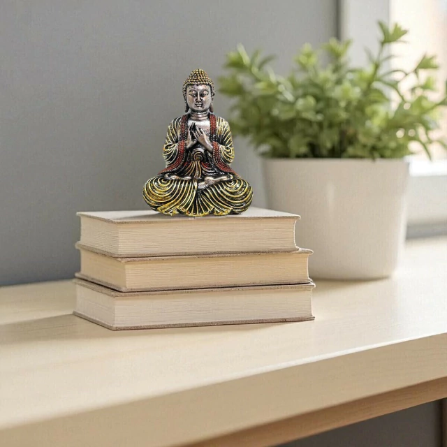 Transforme seu lar em um refúgio de boas energias com este lindo Buda prateado, com leves traços dourados e a mão erguida em sinal de proteção e bênçãos.