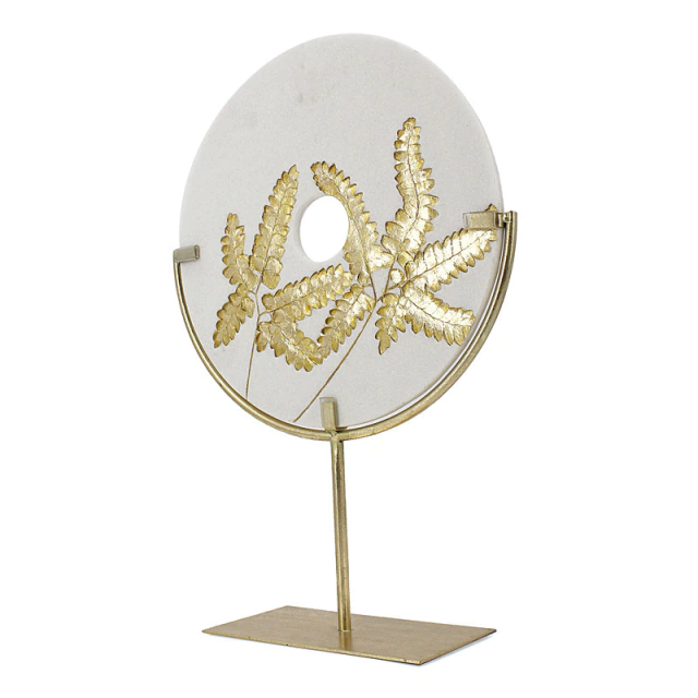 Deixe-se envolver pela moda e sofisticação da Escultura em forma de Círculo em resina, adornada por folhas douradas na base em metal. Uma obra que resplandece luxo e bom gosto. Com suas dimensões de 32 cm de comprimento, 10 cm de largura e 46 cm de altura, esta escultura se destaca como um ponto focal de requinte e glamour.