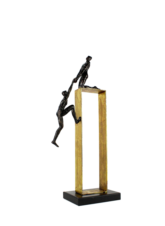 Esta escultura de 2 pessoas em resina se ajudando em resina com apoio dourado em metal tem significado mágico. Um ajudando o outro é sempre muito melhor. Não é mesmo? Então, esta escultura tem toda esta simbologia. Além disto, estas pessoas possui um imã na mão dando um movimento único à mesma. Peça exclusiva e cheio de charme, esta possui altura de 51 cm, profundidade de 12 cm e largura de 22 cm. Fácil de harmonizar, esta linda escultura ficará ótimo no seu aparador, home theater ou na sua estante. Como um significado deste e com este design diferenciado, não tem como não se apaixonar...