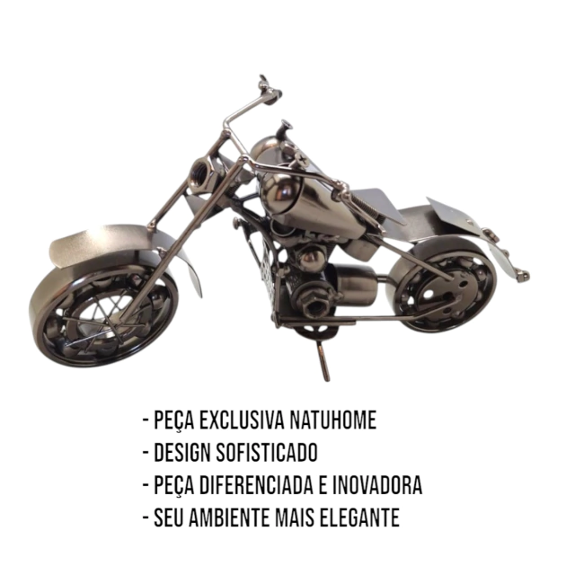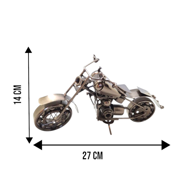 Para quem ama estilo, personalidade e objetos que contam histórias: apresentamos essa incrível Moto em Metal Prateado, feita artesanalmente com peças sobressalentes — um verdadeiro destaque na decoração!