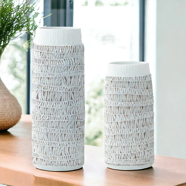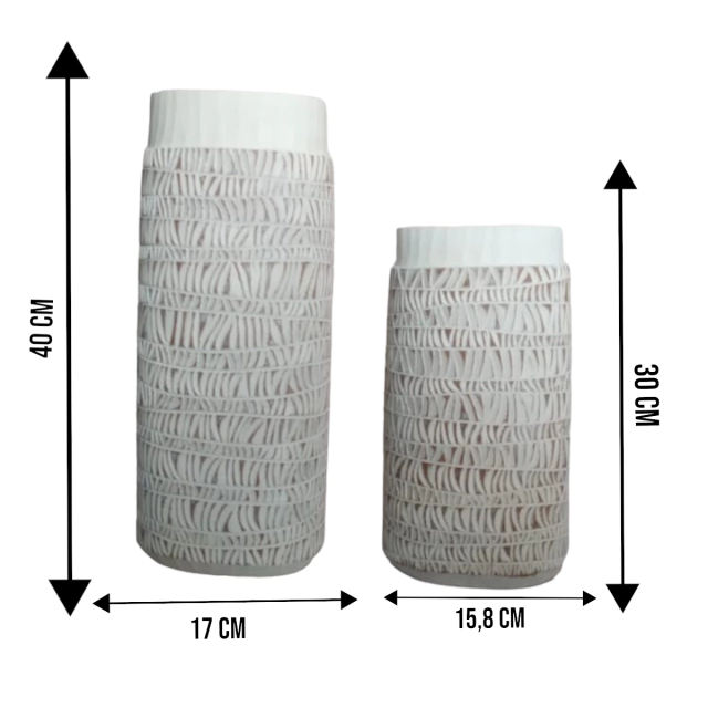 Deixe-se encantar pela simplicidade e elegância dos Vasos em Resina no tom branco e bege com estilo rústico, uma dupla que traz um toque acolhedor e campestre à sua decoração. O vaso maior, medindo 17 cm de comprimento, 12 cm de profundidade e 40 cm de altura, e o menor, com 15,8 cm de comprimento, 11 cm de profundidade e 30 cm de altura.