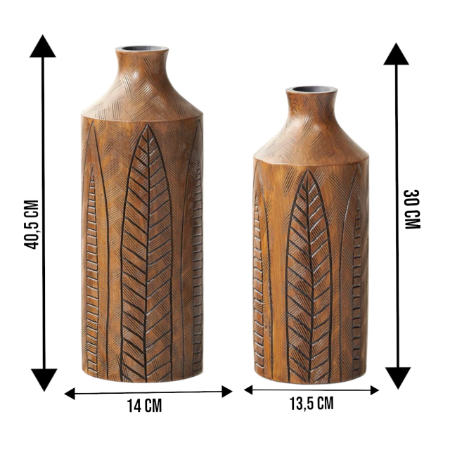 Deixe-se envolver pela sofisticação e pela moda dos vasos em resina no tom madeira escura com desenho de folha. Uma dupla que combina a beleza natural com o requinte da madeira escura. Com o vaso maior medindo 14 cm de comprimento, 14 cm de profundidade e 40,5 cm de altura, e o menor com 13,5 cm de comprimento, 13,5 cm de profundidade e 30 cm de altura, essa combinação destaca-se pela sua elegância e sofisticação.